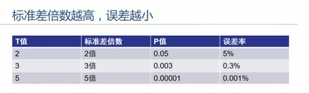 从图中,我们可以看到,如果 T 值越大,P 值越小,产生的结果误差率就越小。如果 T 值是 5 倍的标准差,那么该结果的有效率为 99.999%。因此,标准差倍数越高,T值越高,统计结果就越可信。