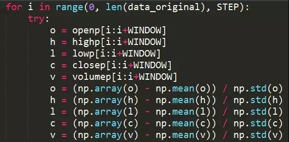 我们不需要预测一些确切的值,所以预期的价和未来的变化对我们来说并不感兴趣——我们只需要预测这个时刻是上涨还是下跌。 这就是为什么我们会尝试和标准化我们30天的窗口只通过他们的均值和方差(z-score 规范化),假设在单一时间窗口中,它们没有变化很大,不会影响未来的信息。