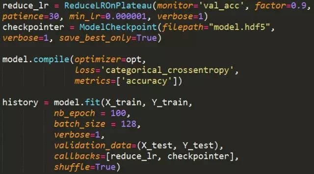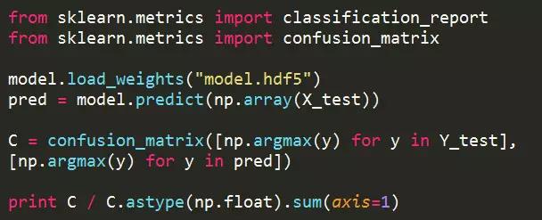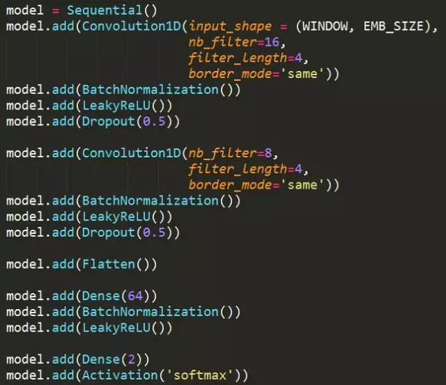 如前所述,使用CNN作为分类器。 主要选择它是因为超参数的灵活性和可解释性(卷积核,下采样大小等)和RNNs性能类似,比MLP更好,训练更快。代码如下: