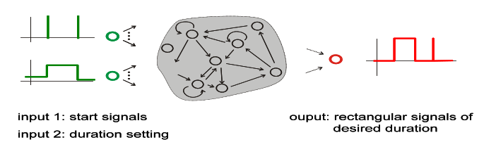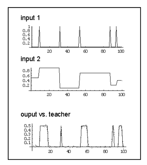 下面看一个运用RNN进行时序建模的例子,考虑这样一个定时问题,输入分为两部分,u1是作为触发脉冲,而u2是作为输出的duration。当u1为1时,u2便立即产生一个随机数,而此时的输出0.5,并且duration为10×u2;其他时刻,输出均为0。