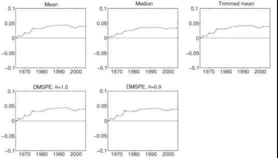 下图实线描述了单个预测回归模型在1965.1-2005.1的样本外预测值,虚线描述了历史平均预测模型的预测值,右下角的图描述的是组合预测模型的样本外预测值(采用的是mean combining method)。单个预测模型的样本外预测值波动比较大,包含大量噪音,给出错误信号,影响预测质量。而mean组合预测的样本外预测值比较稳定,但也呈现出比较合理的波动。