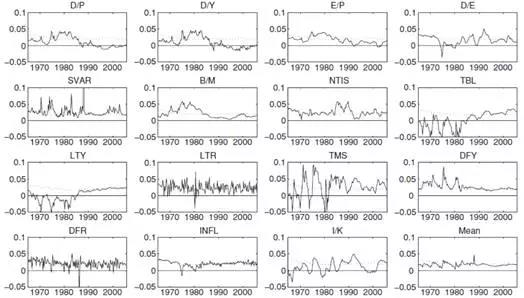 (2)到2005年末为止,大多数模型无论是在IS还是在OOS中都丧失了统计显著性。在OOS中,大多数模型不仅不能在统计意义上或经济意义上打败无条件基准水平(历史均值),而且表现的还不如它。如果我们把目光集中在1975年以后的时间里,我们会发现,没有哪一个模型在OOS中有突出的表现,而且也几乎没有可接受的IS显著水平。