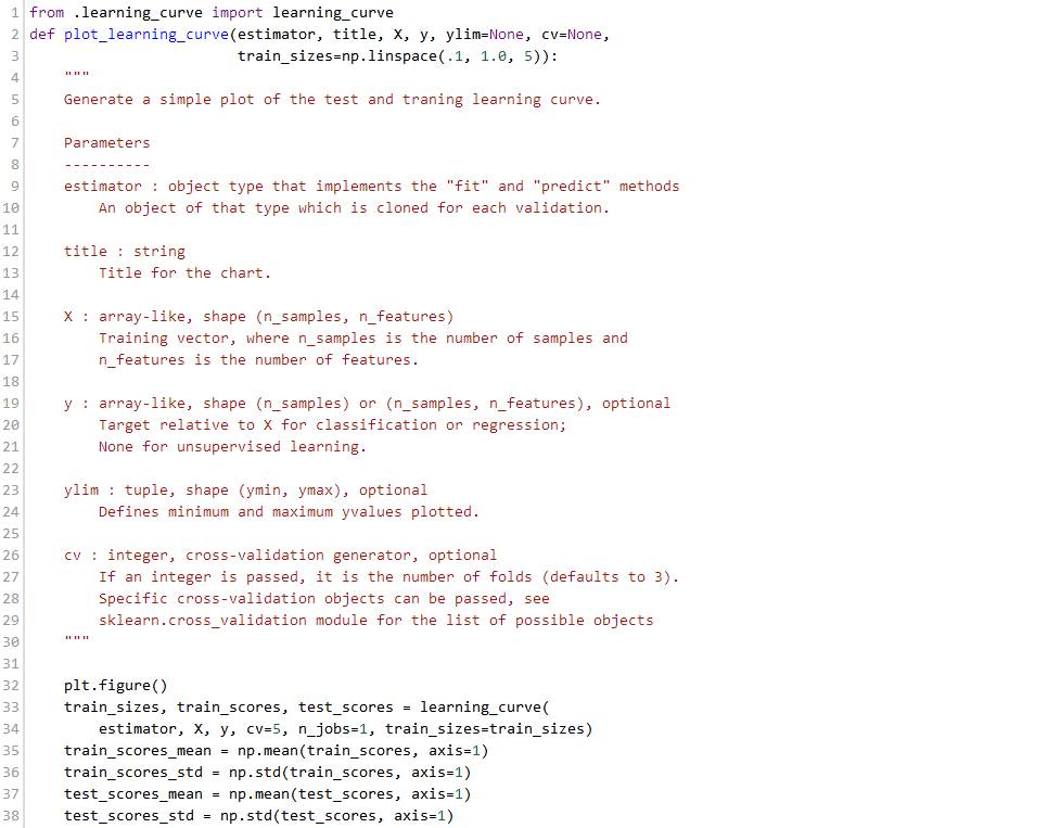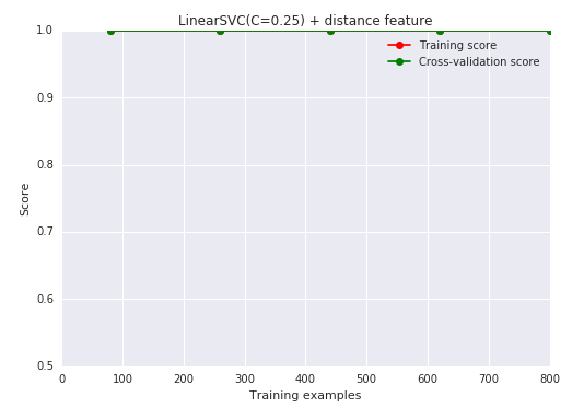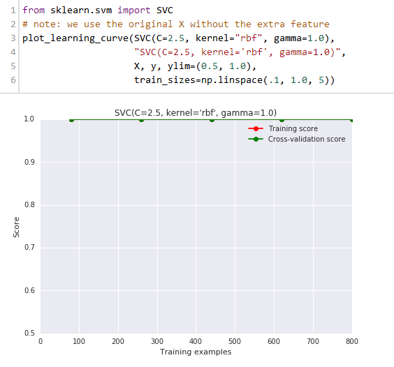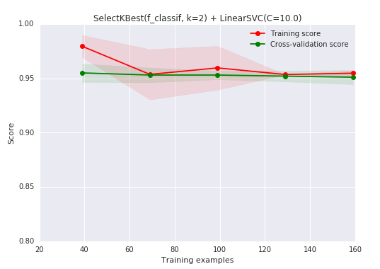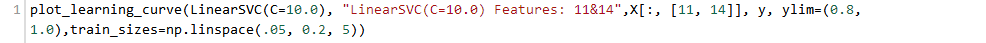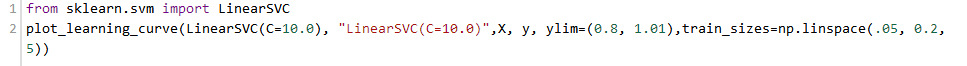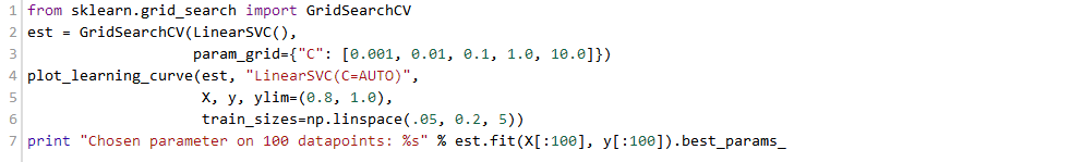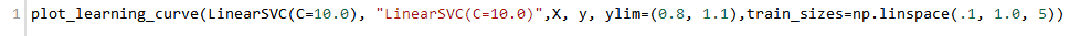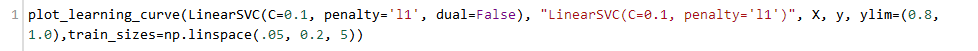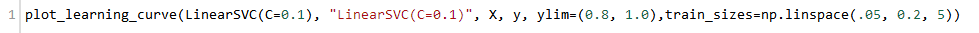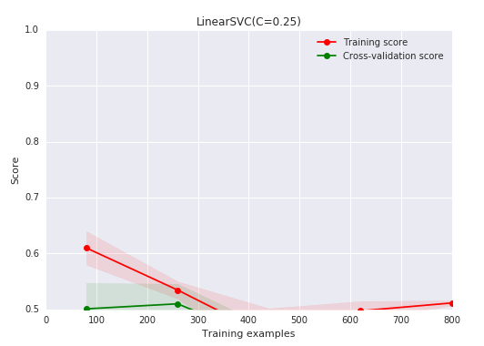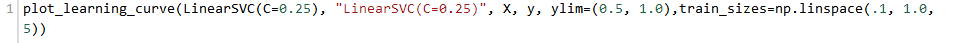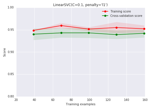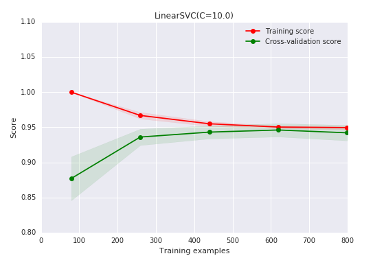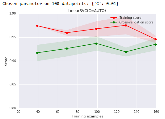 我们有了1000个样本,要预测一个类别,并且有了标签,那么备忘单推荐我们首先使用LinearSVC(LinearSVC代表线性核的支持向量分类,并且对于这类特殊问题使用一个有效的算法)。所有我们做了个试验。LinearSVC需要选择正则化;我们使用标准L2范数惩罚和C=10.我们分别画出训练分数和验证分数的学习曲线(这个例子中分数代表准确率):