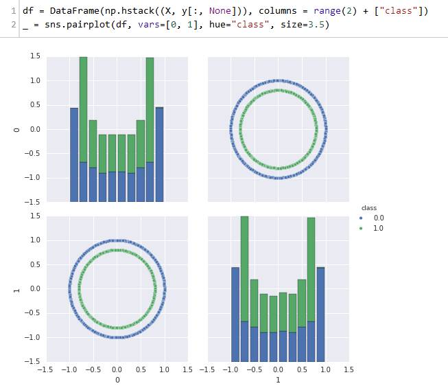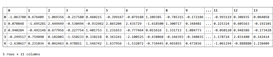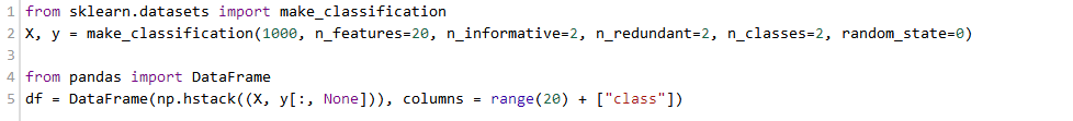 注意到我们为二分类生成了一个数据集,这个数据集包括1000个数据点,每个特征20维。我们已经使用pandas的DataFrame类把数据和类别封装到一个共同的数据结构中。通过直接查看原始特征值,我们很难获得该问题的任何线索,即使在这个低维的例子中。因此,有很多的提供数据的更容易视图的方法;其中的小部分将在接下来的部分中讨论。