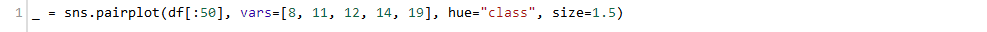 第一步是使用 pairplot 生成散点图和直方图。两种颜色对应了两个类别,我们使用了特征的一个子集、仅仅使用前50个数据点来简化问题。