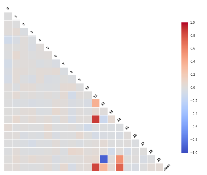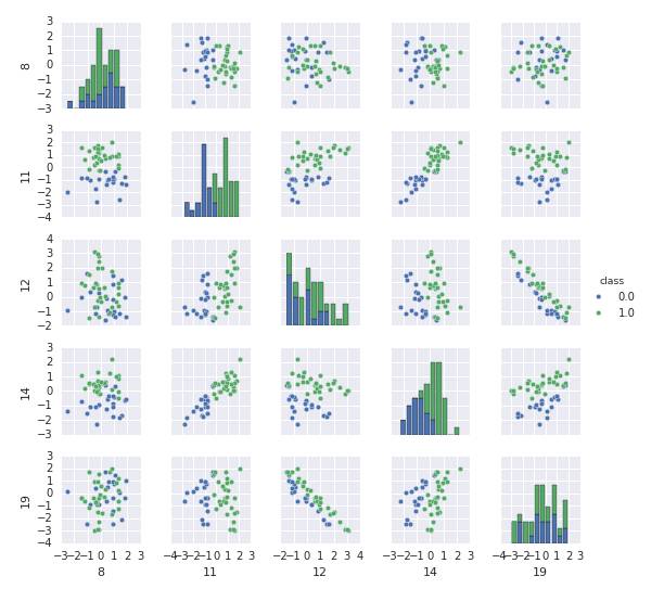 我们可以发现之前的观察结果在这里得到了确认:特征11和14与类强相关(他们有丰富的信息量)。更进一步,特征12和特征19强负相关,特征19和特征14强相关。因此,有一些特征是冗余的。这对于有些分类器可能会出现问题,比如,朴素贝叶斯,它假设所有的特征都是**的。剩下的特征大部分都是噪声,他们既不相互关联,也不和类别相关。