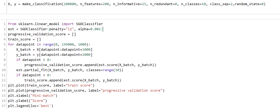SGDClassifier允许小批量扫描数据,这对于数据量太大不能放到内存中时有帮助。交叉验证和这项技术不兼容;使用逐步验证代替:这里,估计器总是在训练数据集的下一块上进行测试(在用它进行训练之前)。训练之后,会再次进行测试来检查它适应数据的能力。