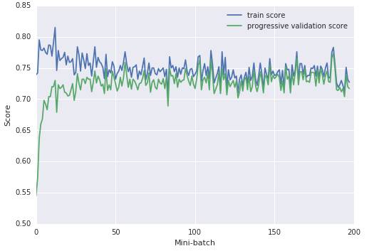 这个图告诉我们,在50个mini-batches的数据之后,我们已经不能再提高验证数据了,因此可以停止训练了。由于训练分数不是很高,我们可能是欠拟合而不是过拟合。要是使用rbf核测试一下就更好了,但是SGDClassifier很不幸的不兼容核技巧。替代方法是可以使用一个多层的感知机,它也可以使用随机梯度下降进行训练,但是一个非线性模型,或者像备忘单建议的,使用核近似法。