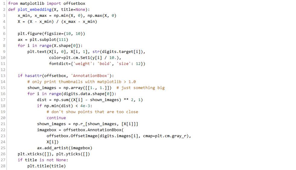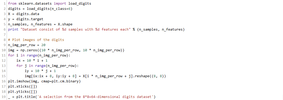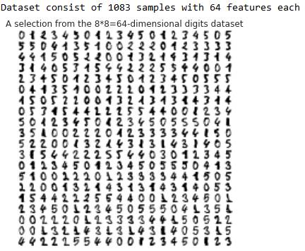 因此我们有1083个手写数字(0,1,2,3,4,5)样本,每一个样本由8*8的4bit像素(0,16)灰度图片组成。因此特征的维数适中(64);但是,这64维空间的可视化是非常重要的。我们来说明不同的减少维数(至二维)方法,基于http://scikit-learn.org/stable/auto_examples/manifold/plot_lle_digits.html#example-manifold-plot-lle-digits-py