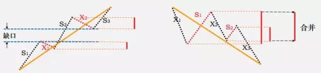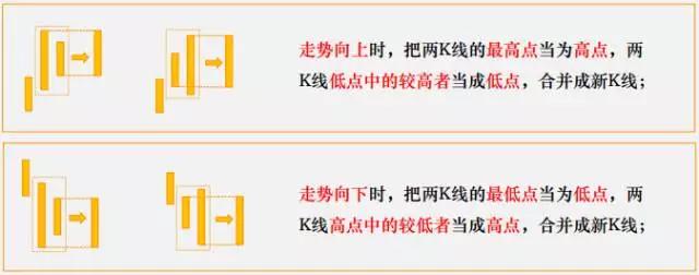 相邻两K线可能出现包含关系( 注: K线包含影线,且不分阴阳线)