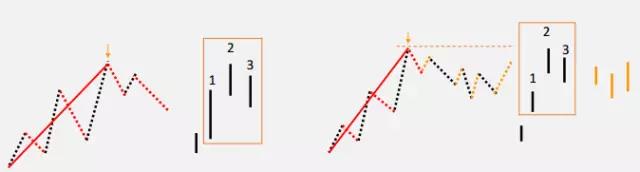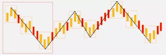 • 对于特征序列,将每一元素看成一K线,也存在所谓的包含关系,也可以对此进行K线