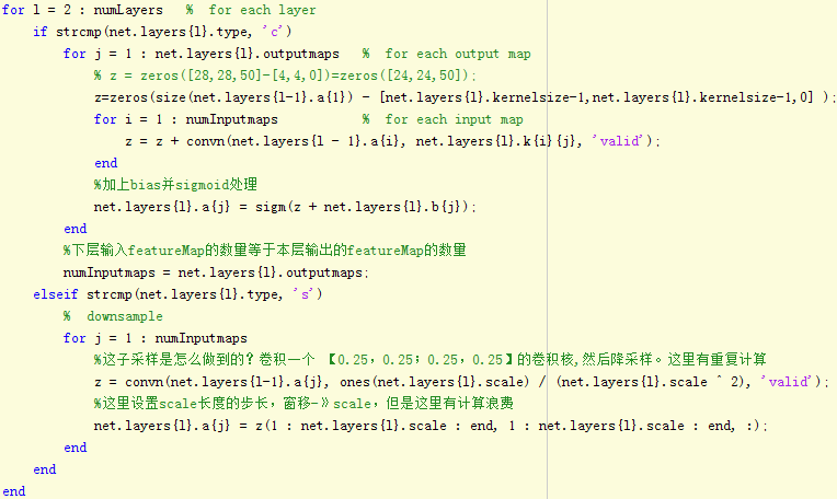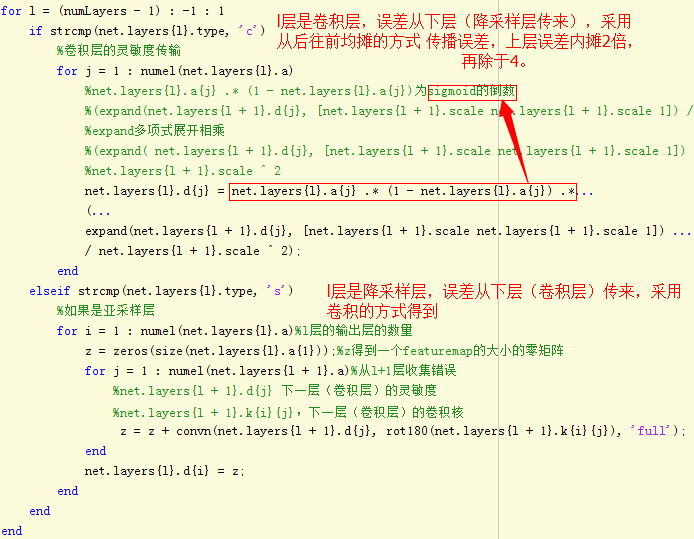 如果本层是卷积层,它的误差是从后一层(降采样层)传过来,误差传播实际上是用降采样的反向过程,也就是降采样层的误差复制为2*2=4份。卷积层的输入是经过sigmoid处理的,所以,从降采样层扩充来的误差要经过sigmoid求导处理。
