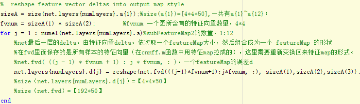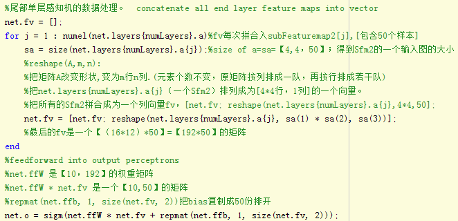 3、尾部单层感知机的数据处理,需要把subFeatureMap2连接成为一个(4*4)*12=192的向量,但是由于采用了50样本批训练的方法,subFeatureMap2被拼合成为一个192*50的特征向量fv;