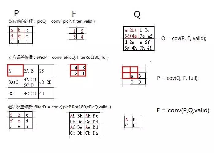 如果本层是降采样层,他的误差是从后一层(卷积层)传过来,误差传播实际是用卷积的反向过程,也就是卷积层的误差,反卷积(卷积核转180度)卷积层的误差,原理参看插图。