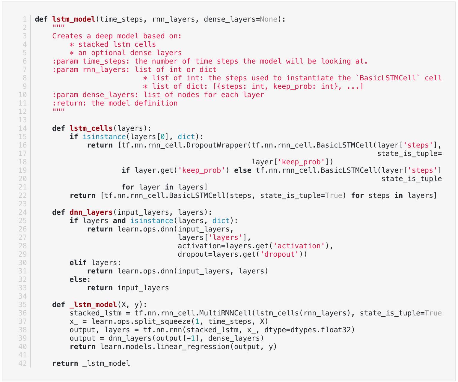 首先建立模型,lstm_model,该模型是不同时间步骤的堆叠lstm单元的列表,后面是一个密集层。