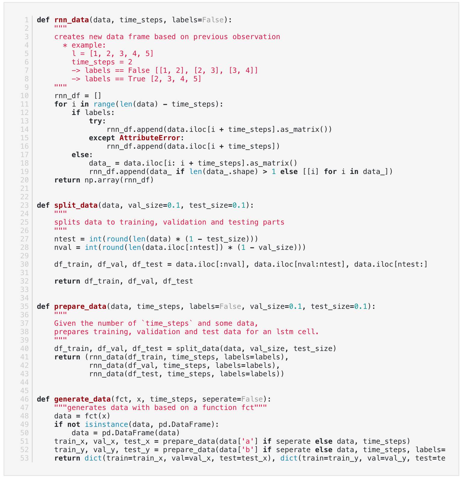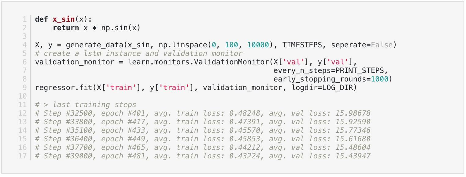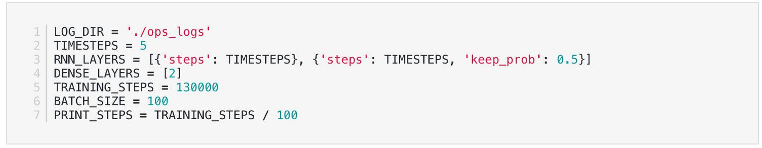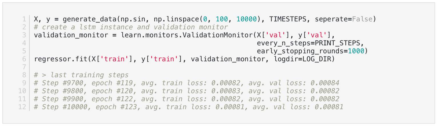 这将创建一个数据,这将允许我们的模型查看time_steps在过去的次数,以进行预测。 所以如果我们的第一个单元格是10个time_steps单元格,那么对于我们想做的每个预测,我们需要为单元格提供10个历史数据点。 y值应该对应于我们想要预测的数据的第十个值。