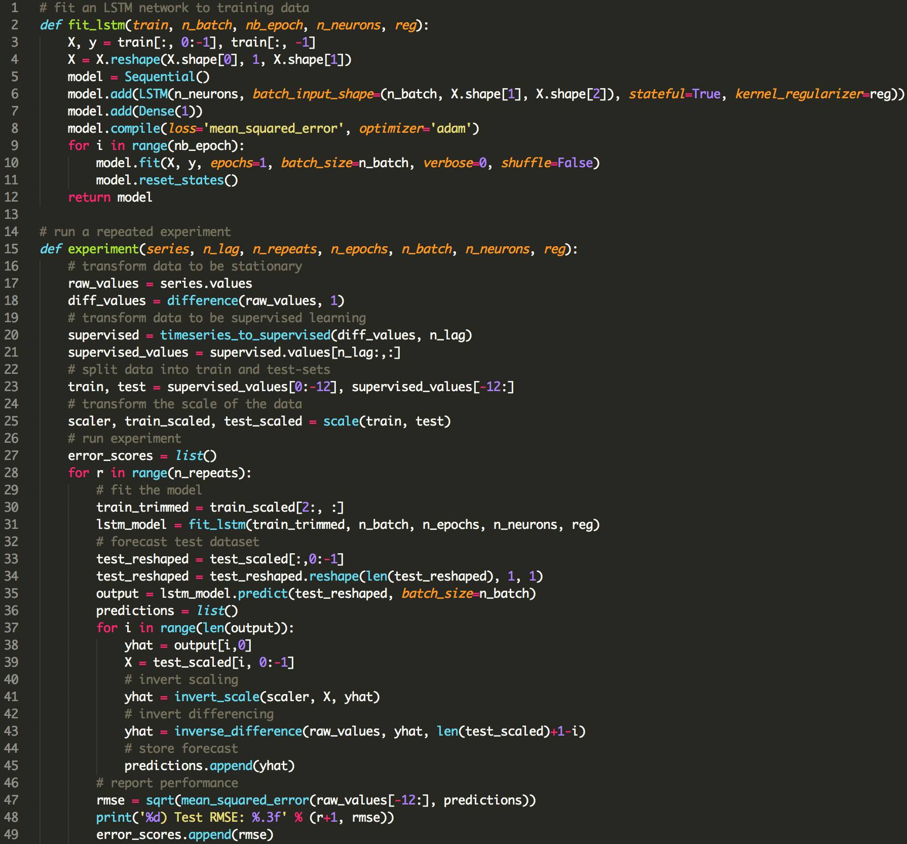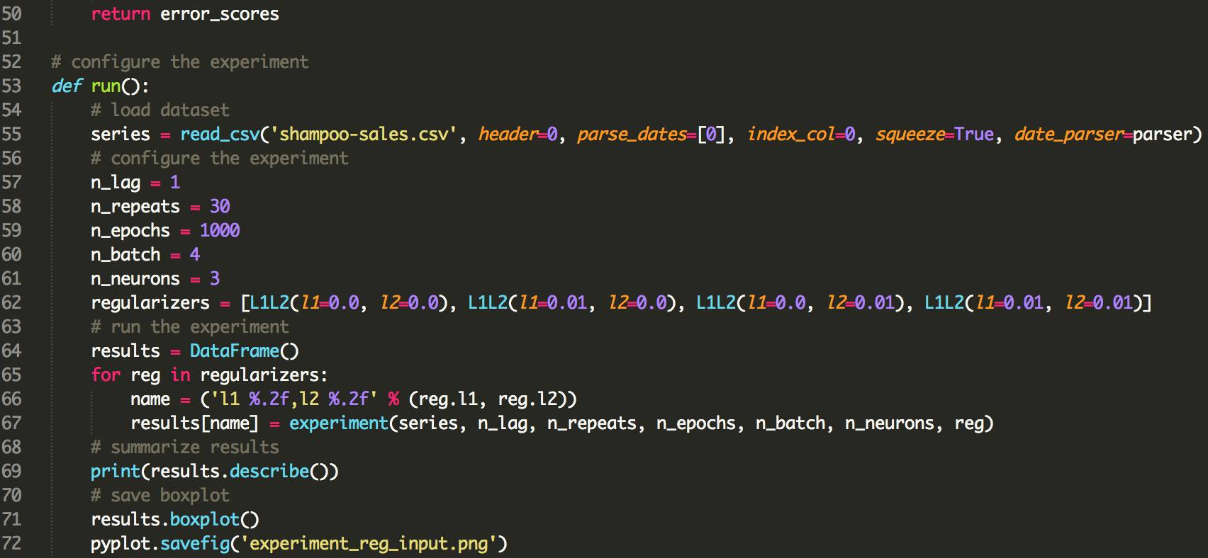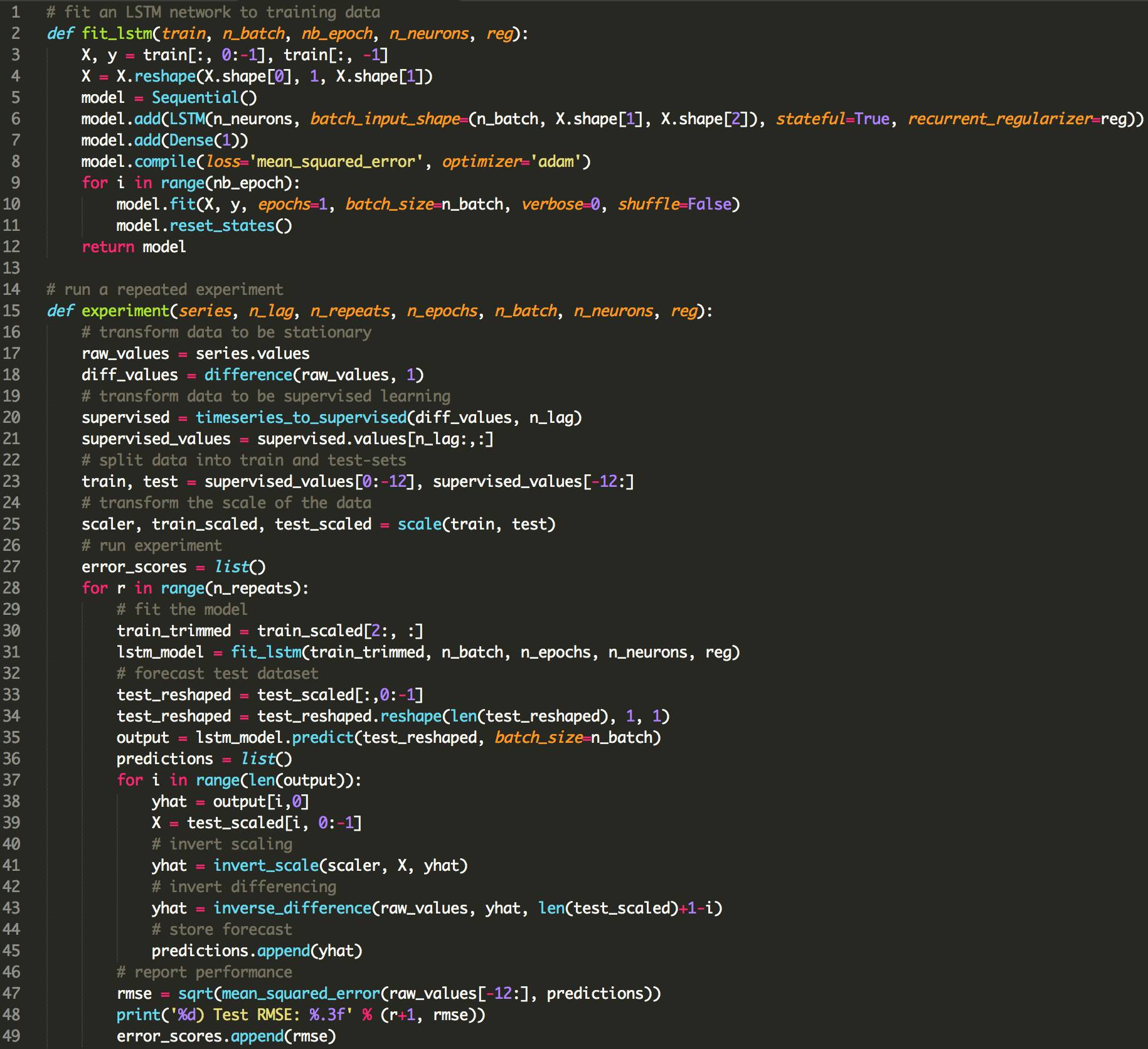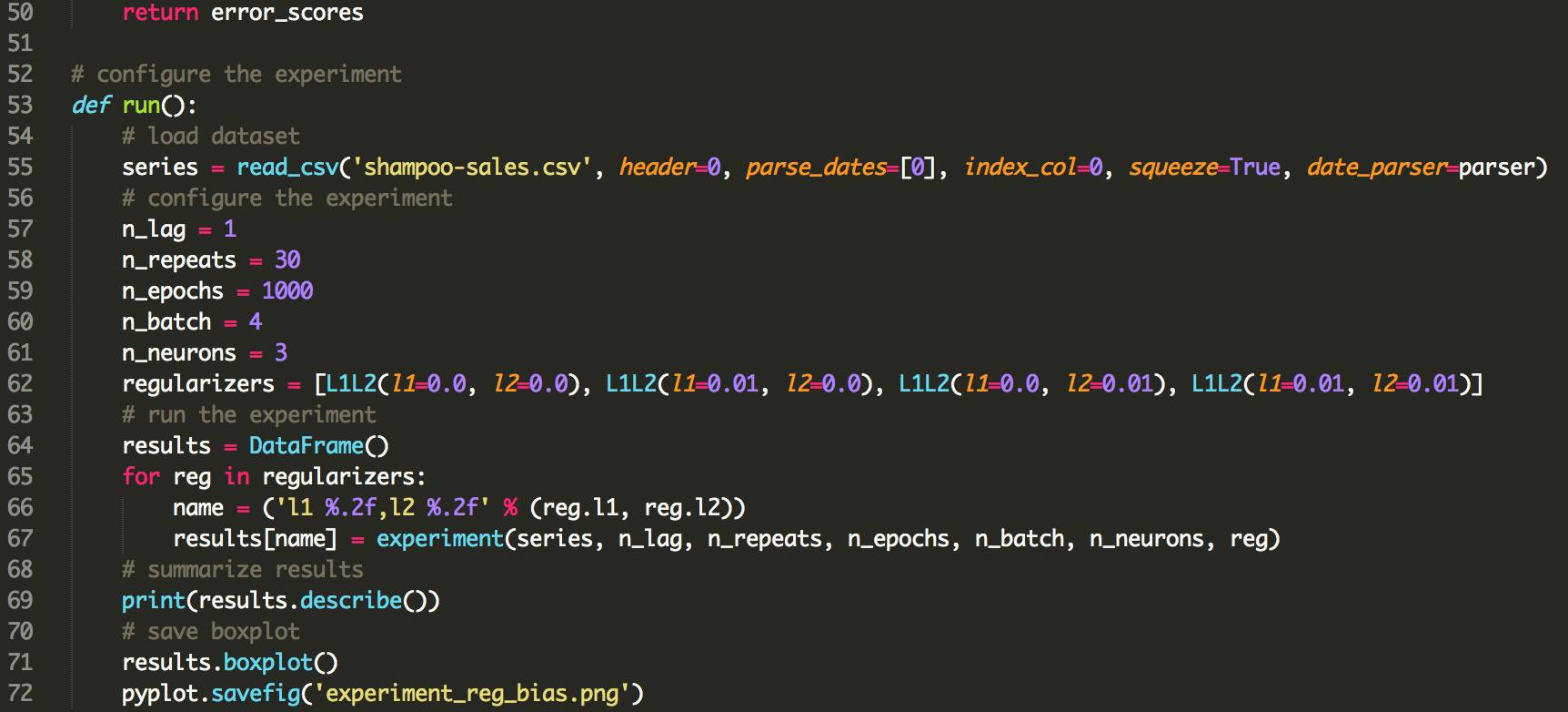 下面列出了使用LSTMs使用偏倚正则化的更新的fit_lstm(),experiment()和run()函数。