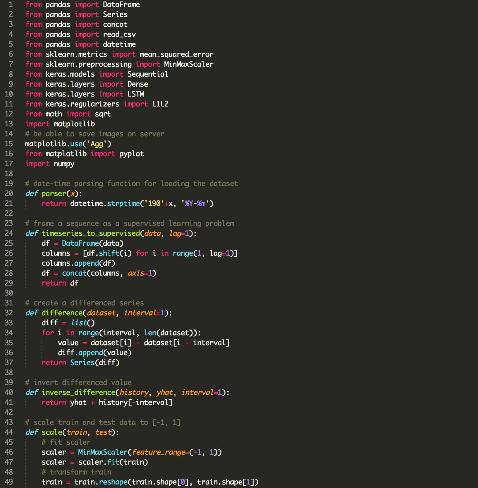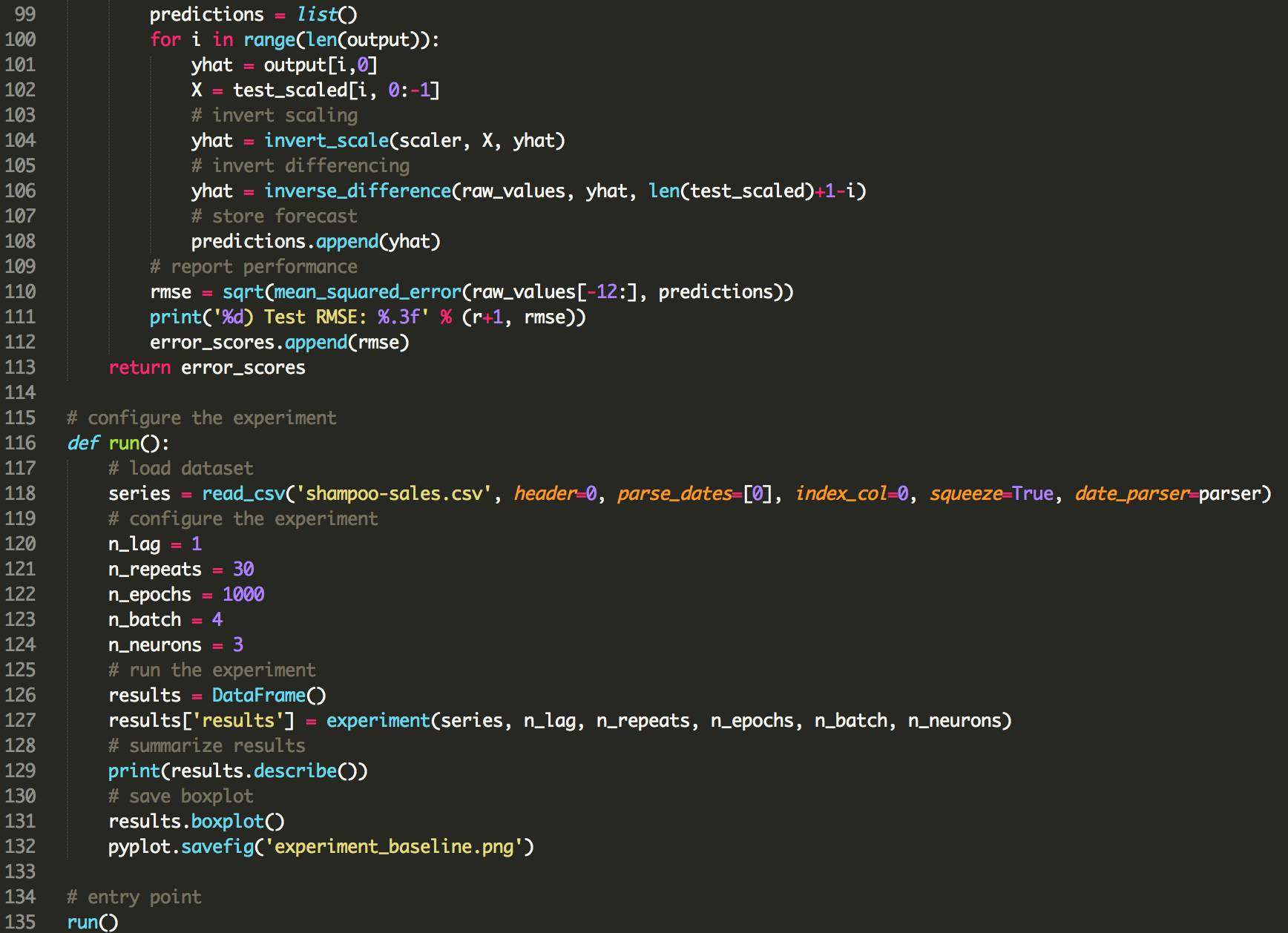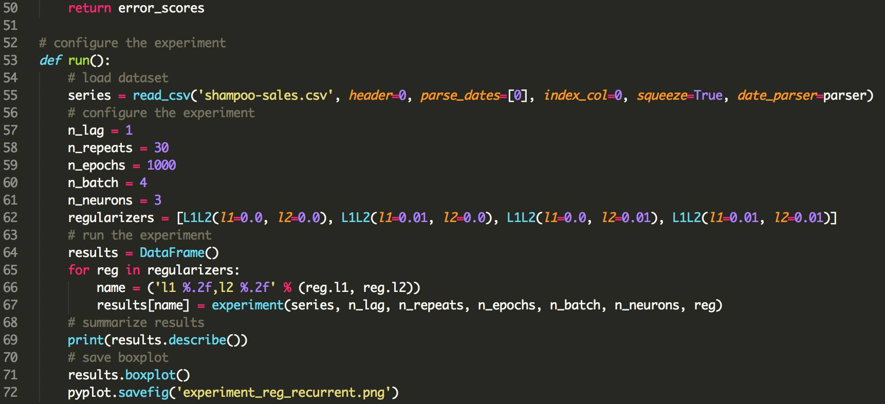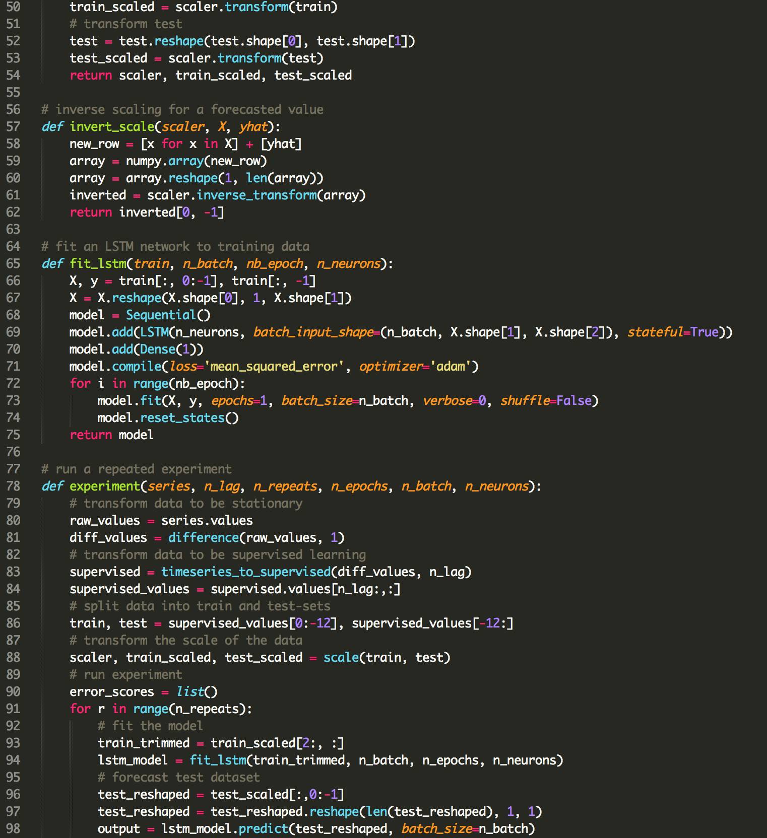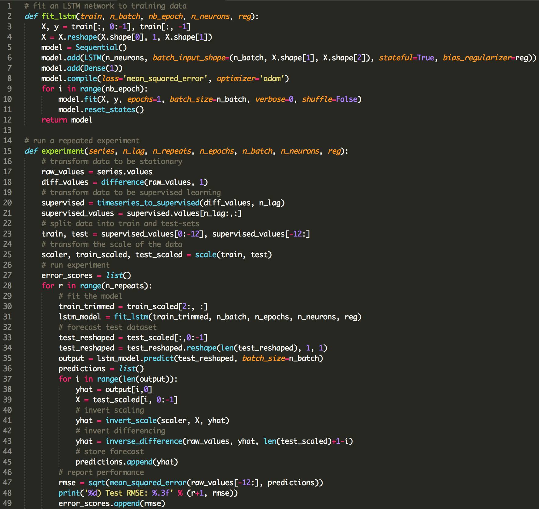 下面列出了使用LSTMs使用偏倚正则化的更新的fit_lstm(),experiment()和run()函数。