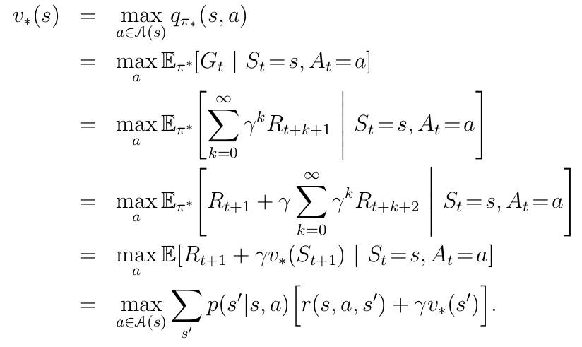 所谓最优状态-价值函数其实很好理解,一方面在数学公式上很好理解,直接对a进行迭代并取最大值即可,而且相比状态-价值函数省去了概率π(a|s)的计算;而直观上我们也可以这么想,前面我们计算的状态-价值函数实际上并没有给出当agent处于每个元胞时候下一步怎么走获得价值最大,而只是给出了当agent处于每个元胞的平均价值,即包含了下一步所有可能的行动。