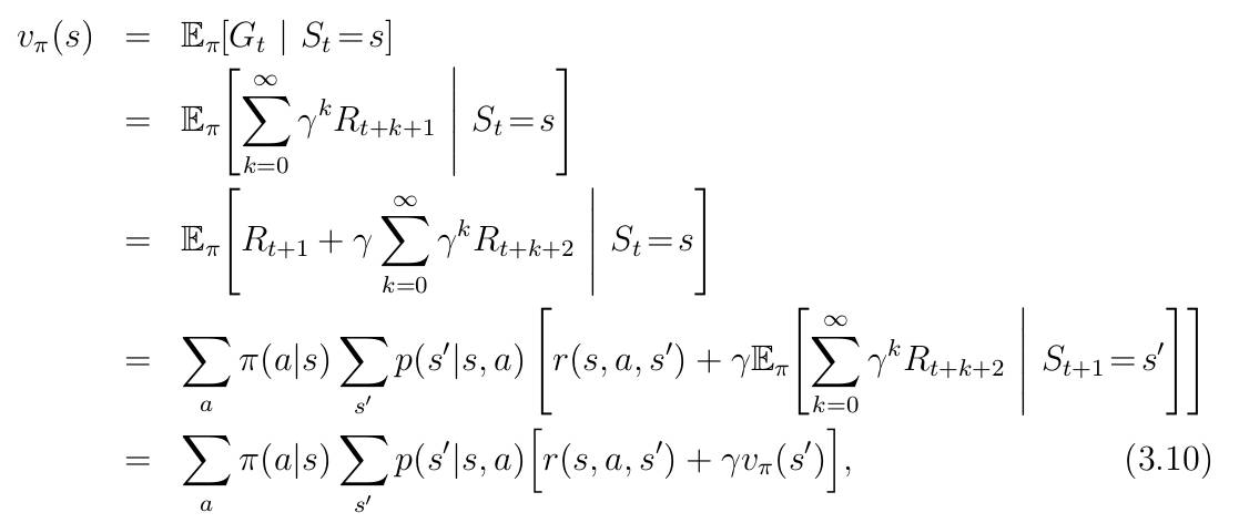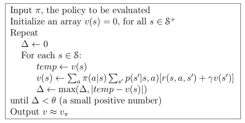 除此之外,我们还应该明白,在计算状态-价值函数的时候,我们是不用区分具体行动的,换句话说我们只用按照题意中的均匀概率进行决策即可。那么,每个元胞的状态-价值函数当然是包含了处在该元胞处的所有行动,因此,我们需要在遵从均匀随机决策下对所有行动进行迭代,直到所有元胞的状态-价值收敛为止,这种做法叫做迭代策略评估。