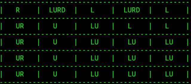 并且,得到的每个元胞的最优行动如下(U、D、L、R分别代表上、下、左、右):