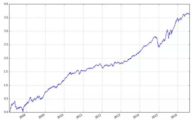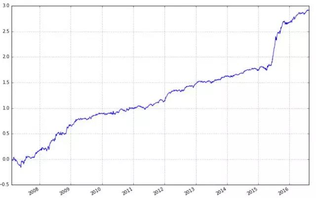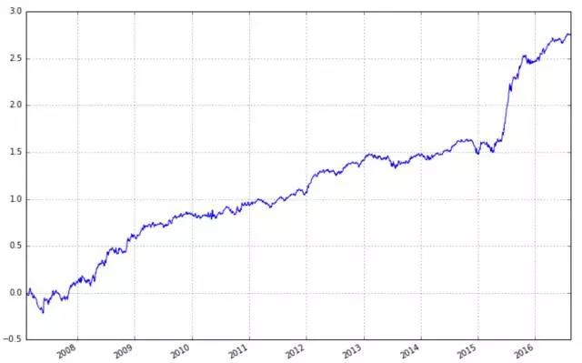 但是在a股,市值因子是一个超强的因子,可以说要找到比市值因子更强的因子会比较难,它在a股的效果要远远超越其在美国股市的效果。我们可以看一下用市值因子回测的结果图,其年华夏普比达到了2.10,第一张图为累和收益率(每日收益之和),第二张图为累计净值。