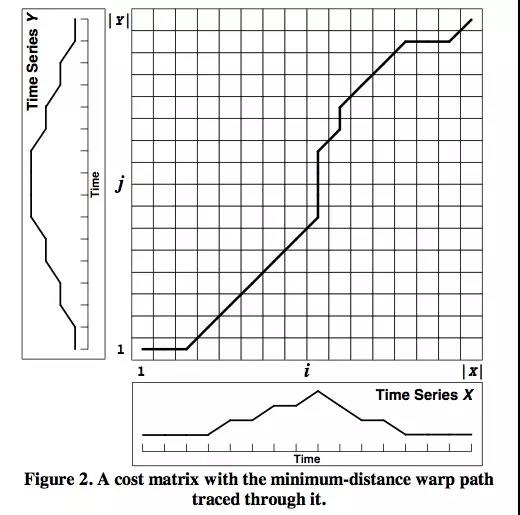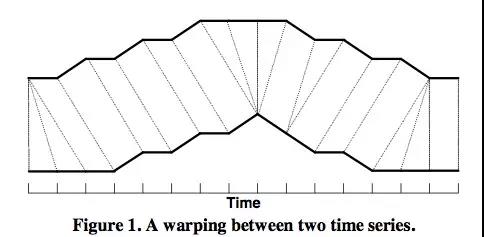 如上图所示,上下两条实线代表两个时间序列,时间序列之间的虚线代表两个时间序列之间的相似的点。DTW使用所有这些相似点之间的距离的和,称之为归整路径距离(Warp Path Distance)来衡量两个时间序列之间的相似性。