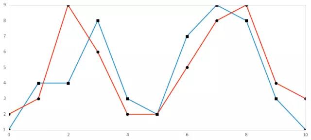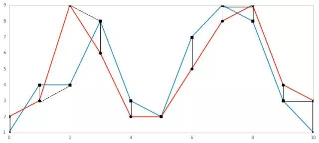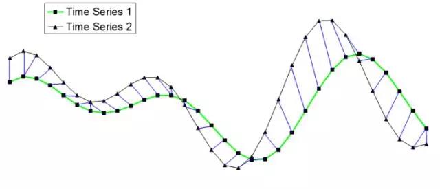 由下图可以看到,动态时间规整算法在进行两个序列匹配时,序列中的点不再是一一对应关系, 而是有一对一、一对多和多对一的不同映射。这种时间上的扭曲通过使得序列之间总体的距离最小化来实现。