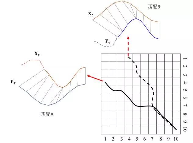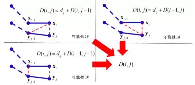 其中, D(i-1,j) 表示 xi-1 与 yj 匹配时的子序列距离, D(i,j-1) 表示 xi 与 yj-1 匹配时的子序列距离, D(i-1,j-1)表示 xi-1 与 yj-1 匹配时的子序列距离。动态时间规整算法从可能的三种拆分方式里边选择最优的一种,如图下图所示。