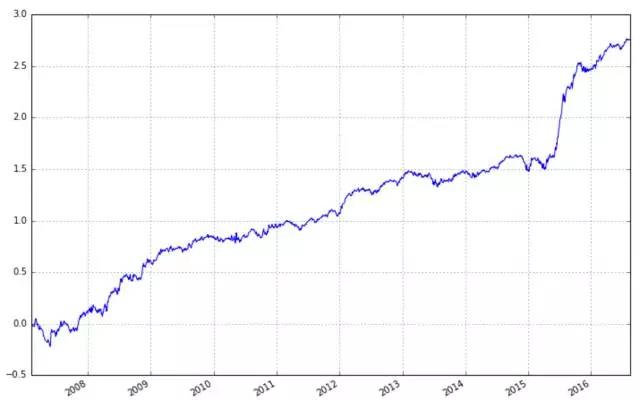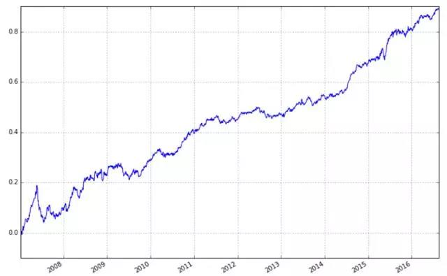 下面进行历史回测,时间段为2007年1月4日到2016年8月15日,股票池为全市场a股去除上市不满3个月的股票、st股以及股价低于1元的股票(计算股票池时需要注意在《量化交易七宗罪》里提到的生存偏差的错误),当天收盘后计算因子值,在第二天的收盘时进行交易,持有资产组合21个交易日,再换仓,一直这样进行下去。回测的累和收益率如下(每天的收益率相加,不是累计净值),年化夏普比为1.82。