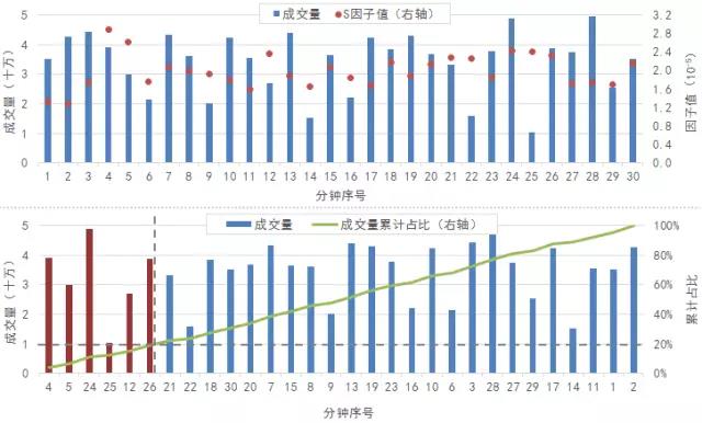 借助指标S,我们可以通过以下方法筛选聪明钱的交易:对于特定股票、特定时段的所有分钟行情数据[2],将其按照指标S从大到小进行排序,将成交量累积占比前20% 视为聪明钱的交易。为了更加形象地展示这一划分过程,图表1给出了一个简单的示例。图表1的上半部分,是一段长度为半小时的分钟行情数据,按照时间顺序排列,时间标签依次为1至30,蓝柱代表每分钟的成交量,红点代表每分钟的S值。图表1的下半部分,我们按照S值从大到小对行情数据进行重新排序,柱子仍代表每分钟的成交量,绿线代表成交量从左到右的累计占比(相对于总成交量)。最后,我们以成交量累计占比20% 作为划分的界线,将最左侧的6个分钟数据(红柱)划归为聪明钱的交易。剩余的分钟数据(蓝柱)则被划为普通资金的交易。