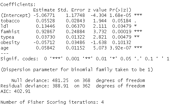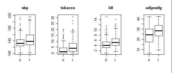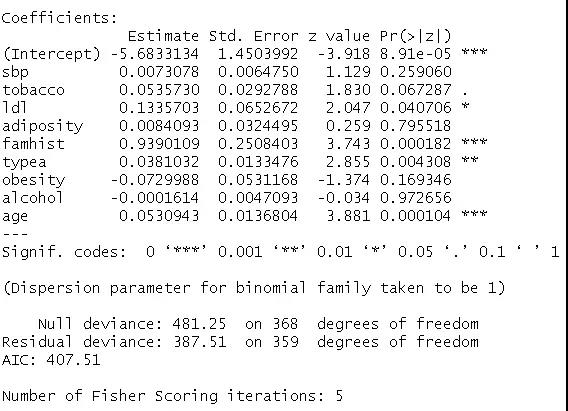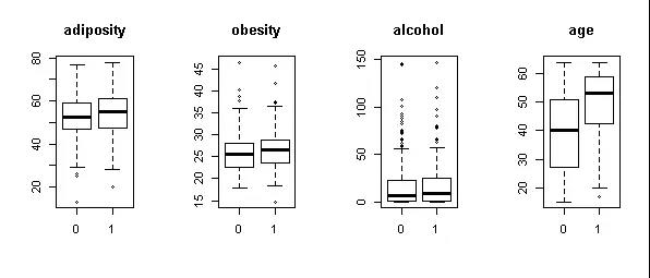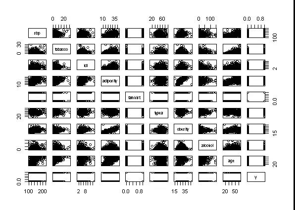 图1是变量的散点矩阵图,可以看出adiposity 和obesity线性相关性较强。