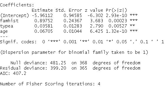 表2是因变量与定性自变量famhist的列联表分析,卡方检验p值为0,在0.05的显著性水平下,famhist对y有显著影响。