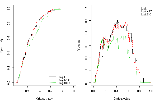 为了比较三个模型的效果,用ROC曲线以及约登曲线来选择最优的模型,如图6所示。