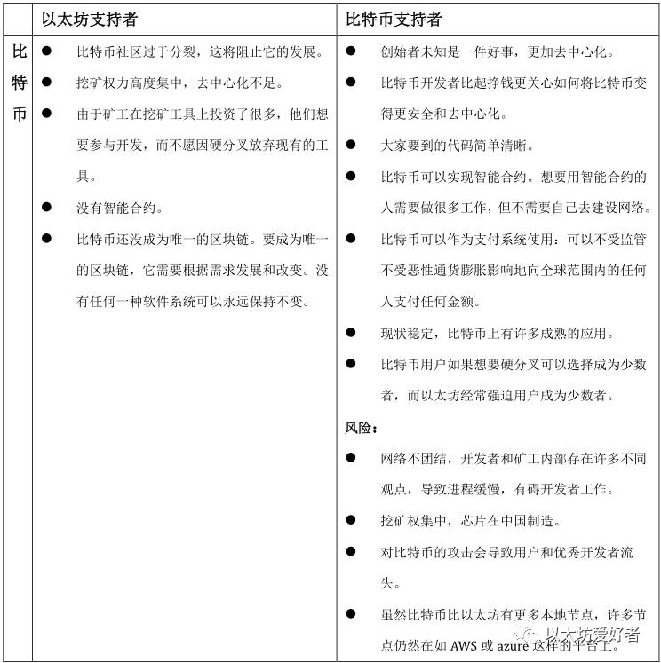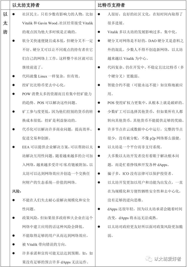以太坊支持者认为,以太坊社区是民主的,同时存在一些有影响力的人物,如Vitalik和Gavin Wood。Vitalik为社区指导提供了明确的方向。同时,社区接受他的大部分观点,不是因为他是创作者,而是他的想法在大多数情况下被证明是对的。因此,冲突和以往的几次硬分叉更加容易的被控制,因为具有不同意见的人可以选择在自己的版本上工作。与比特币不同,以太坊的稳定性和成熟度都有待改进,但其社区变得越来越团结,并且继续取得进展。此外,由于以太坊的支持者对于去中心化的理解角度更为宽松,他们对政府和老牌企业更加友好,而且他们的项目会根据业务需求扩展到许可链和私有链。