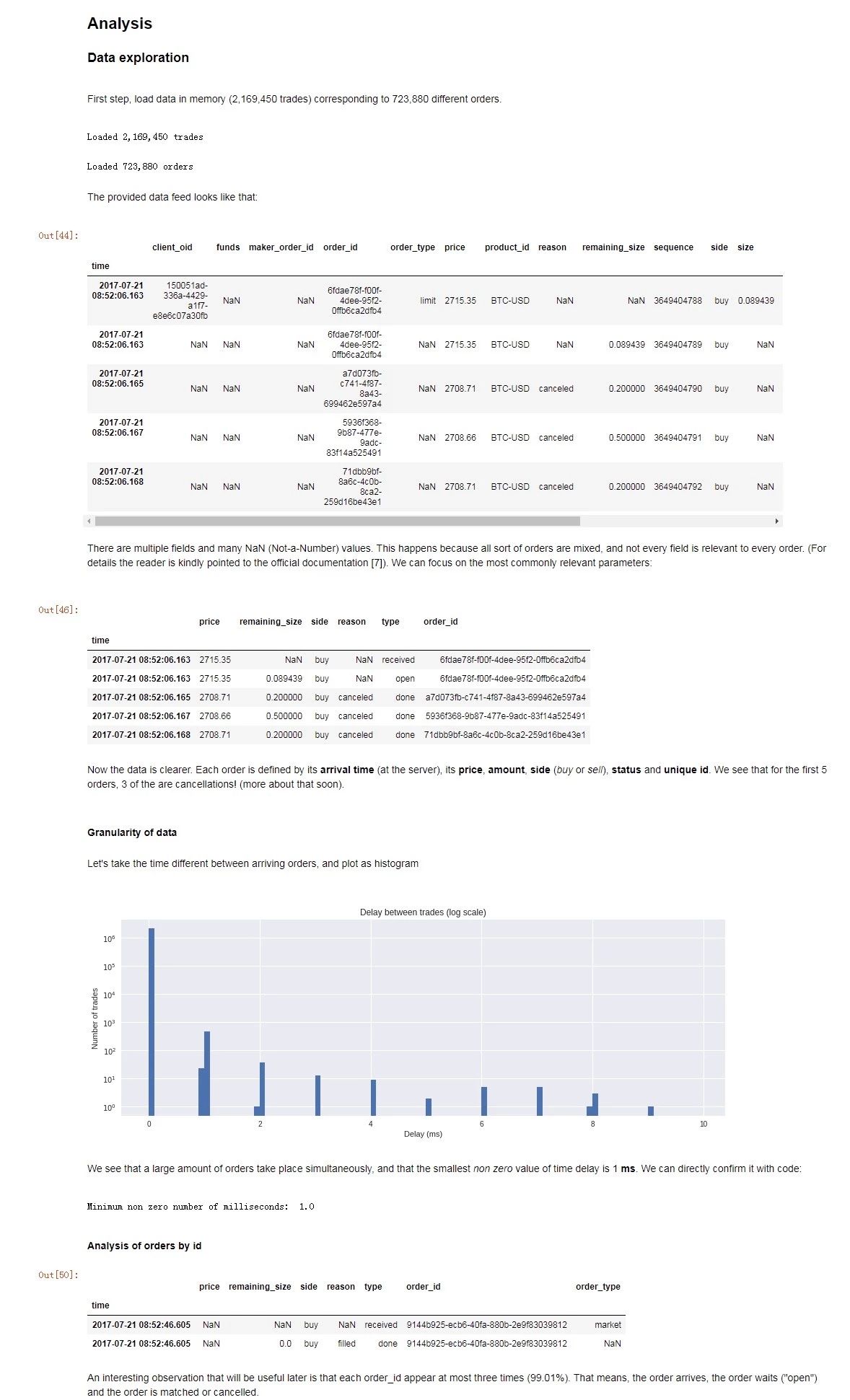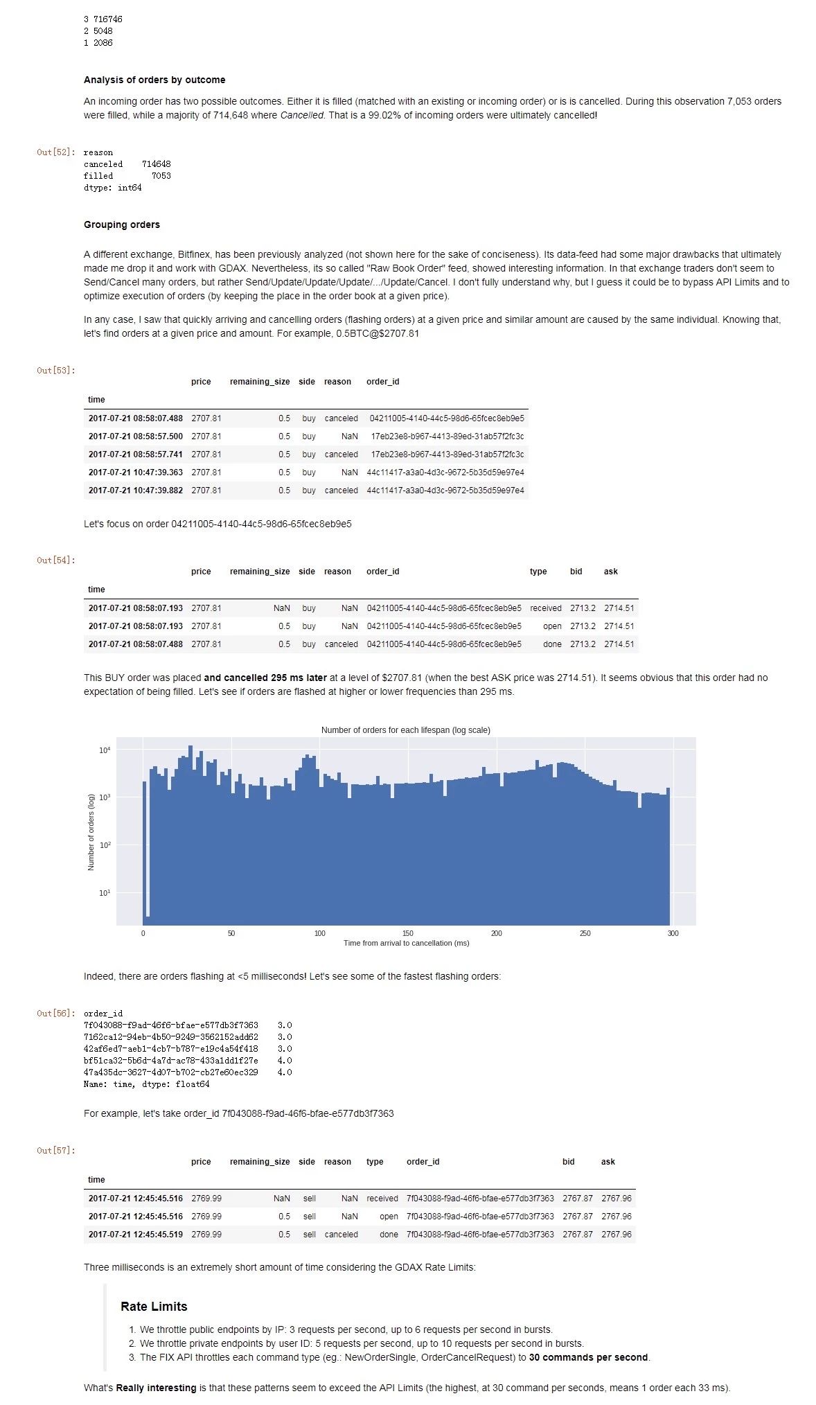 This analysis has been carried out with order data from the Websocket stream from GDAX, a US based digital asset exchange owned by Coinbase. It is one of the largest markets (over 42 MM USD/day) and it exposes a high performance socket where all orders are broadcasted. In addition, it offers some interesting features for data analysis: