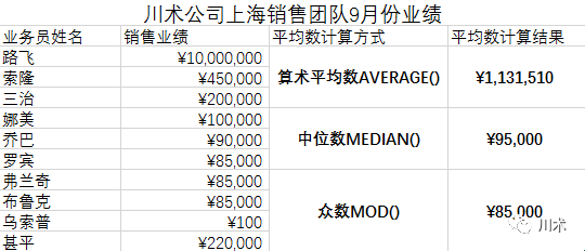 在Excel当中,我们使用MODE()这个函数来计算众数。如下图,大家觉得,在我YY的这个数据集中,哪一种计算方式更合适?算术平均数显然是太夸张了,而中位数和众数差不多,我觉得都可以采纳。