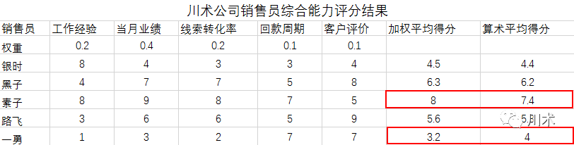 加权算术平均数为了让平均水平的计算方式能涵盖所有的业务场景,还有一种称为“加权算术平均数”的算法需要介绍。这种方法的应用场景其实可以非常广泛,只要满足这样一个假设:数据集中的每个数字对于计算平均水平的重要性是不同的。我们回到第二章中雷达图对应的例子,即川术公司销售员综合能力评分。如下图,我们认为,工作经验、当月业绩、线索转化率、回款周期和客户评价五项得分,其重要性是不同的。所以,我们在权重这一行中,给予了每个考核项不同的权重,业绩最高,获得了0.4的权重,而回款周期和客户评价最低,只有0.1的权重。从加权平均得分和算术平均得分的结果上看,两种算法得出的分值差距还是相当大的。比如素子,得分较高的项目正好就是权重高的项目,因此加权平均得分的数值比算术平均高得多;可一勇就比较悲剧了,表现好的项目权重低,导致加权平均得分比算术平均低得多。