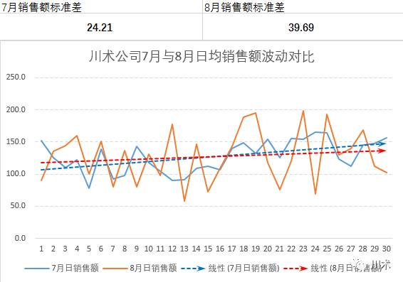 为了进一步认知7月份与8月份业绩波动的区别,你做出了如上的折线图,且添加了线性趋势线来观察变动趋势。直观上看,8月份的折线图,波动确实比7月份要剧烈许多,且从8月11日开始,波动幅度的差别开始加大。说明,8月11日前后的某些决策造成了这样的影响。线性趋势线增长的势头趋于平缓,也一定让你忧心忡忡。
