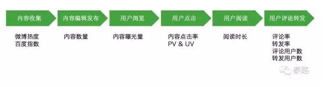 这是一个标准的流程,每个流程都有指标可以建立。内容收集可以建立热点指数,看哪一篇内容比较火。用户浏览用户点击则是标准的PV和UV统计,用户阅读是阅读时长。