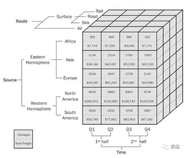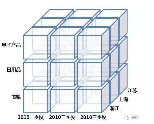 上图就是三个维度组成的数据模型/数据立方体。分别是产品类型、时间、地区。我们既能获得电子产品在上海地区的2010二季度的销量,也能知道书籍在江苏地区的2010一季度销量。
