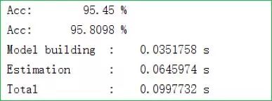 其中第一、二行分别是训练集、测试集上的准确率,接下来三行则分别是建立模型、评估模型和总花费时间的记录。