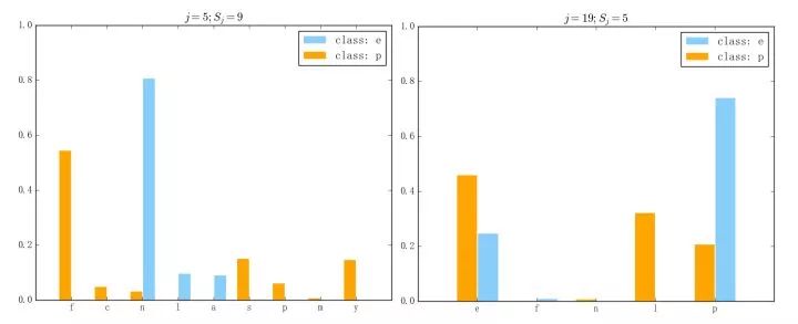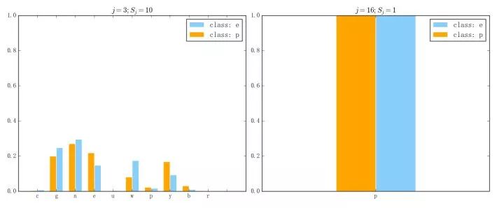 由于蘑菇数据一共有 22 维,所以上述代码会生成 22 张图,从这些图可以非常清晰地看出训练数据集各维度特征的分布。下选出几组有代表性的图片进行说明。