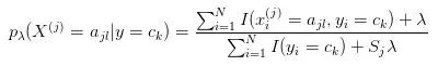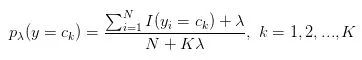 其中的 lb 为平滑系数(默认为 1、亦即拉普拉斯平滑),这对应的公式其实是带平滑项的、先验概率的极大似然估计:
