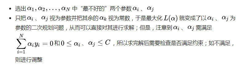 SMO 是由 Platt 在 1998 年提出的、针对软间隔最大化 SVM 对偶问题求解的一个算法,其基本思想很简单:在每一步优化中,挑选出诸多参数(