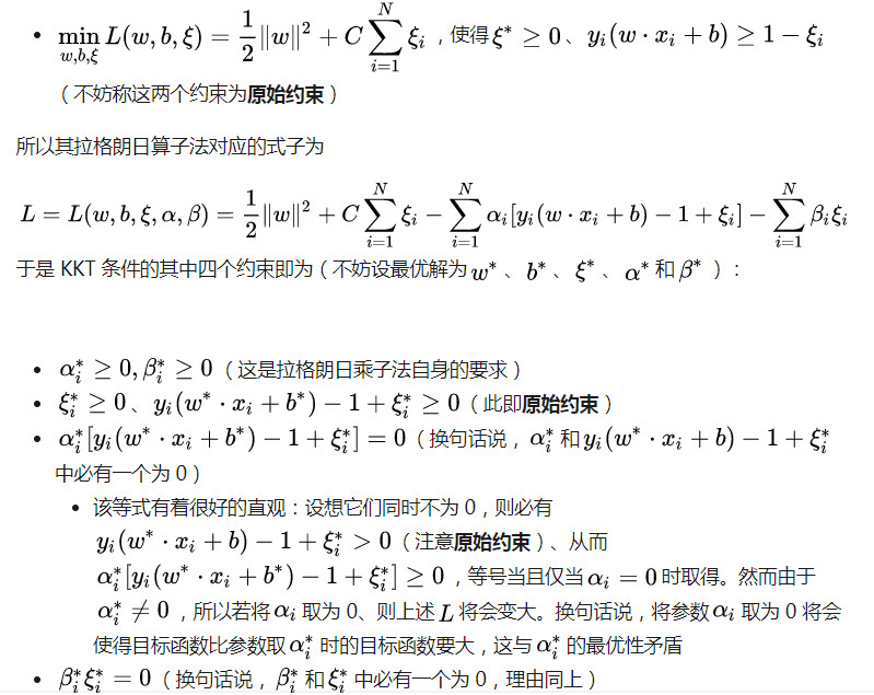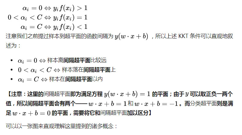 这里就有了一个叫 KKT 条件的东西,其详细的陈列会放在文末,这里就仅简要的说明一下。具体而言,对于已有的模型f=wx+b来说,ai及其对应样本(xi,yi)的 KKT 条件为: