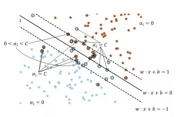 此外,支持向量之所以称之为“支持”向量,是因为在理想情况下,仅利用支持向量训练出来的模型和利用所有样本训练出来的模型是一致的。这从直观上是好理解的,粗略的证明则可以利用其定义来完成:非支持向量的样本对应着ai=0,亦即它对最终模型——