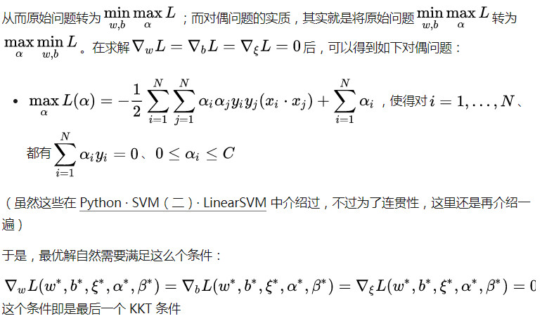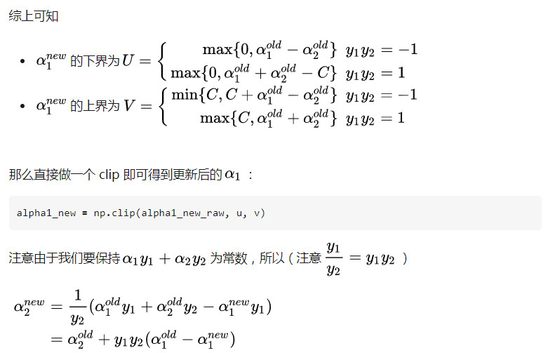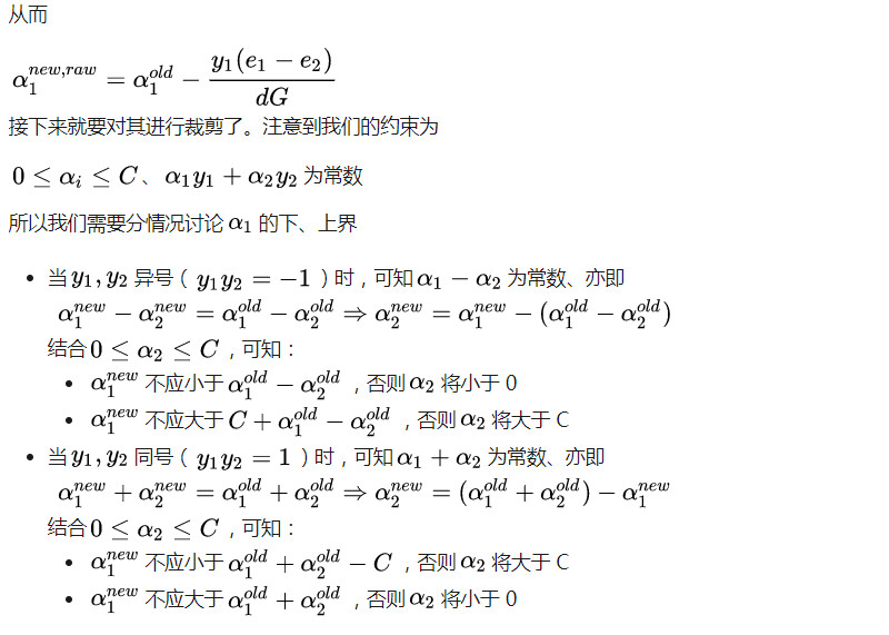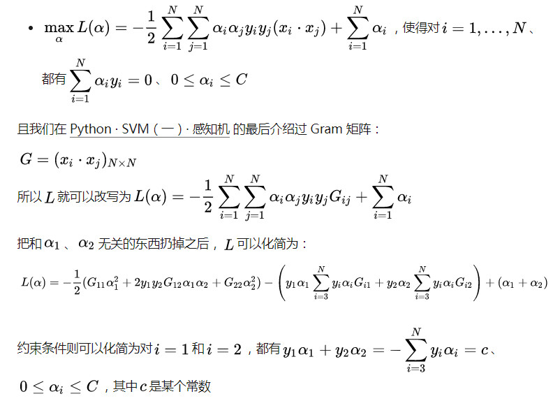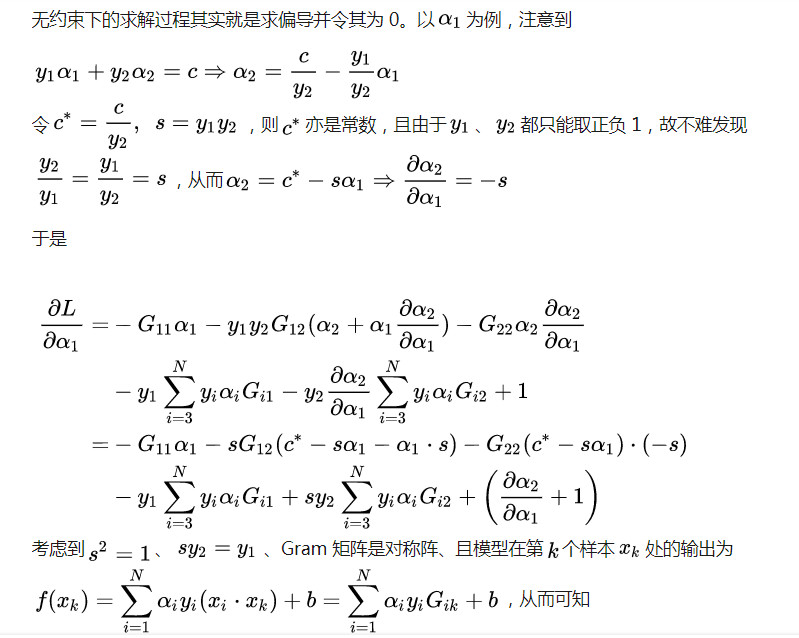 至于 SMO 算法的第二步,正如前文所说,它的本质就是一个带约束的二次规划,虽然求解过程可能会比较折腾,但其实难度不大。具体步骤会放在文末,这里就暂时按下