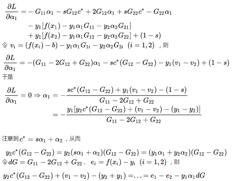 )中的两个参数(ai、aj)作为“真正的参数”,其余参数都视为常数,从而问题就变成了类似于二次方程求最大值的问题,从而我们就能求出解析解