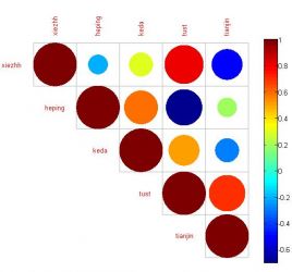 圆形色块,根据矩阵元素值自动确定色块的大小和颜色,不显示字体,上三角形式显示